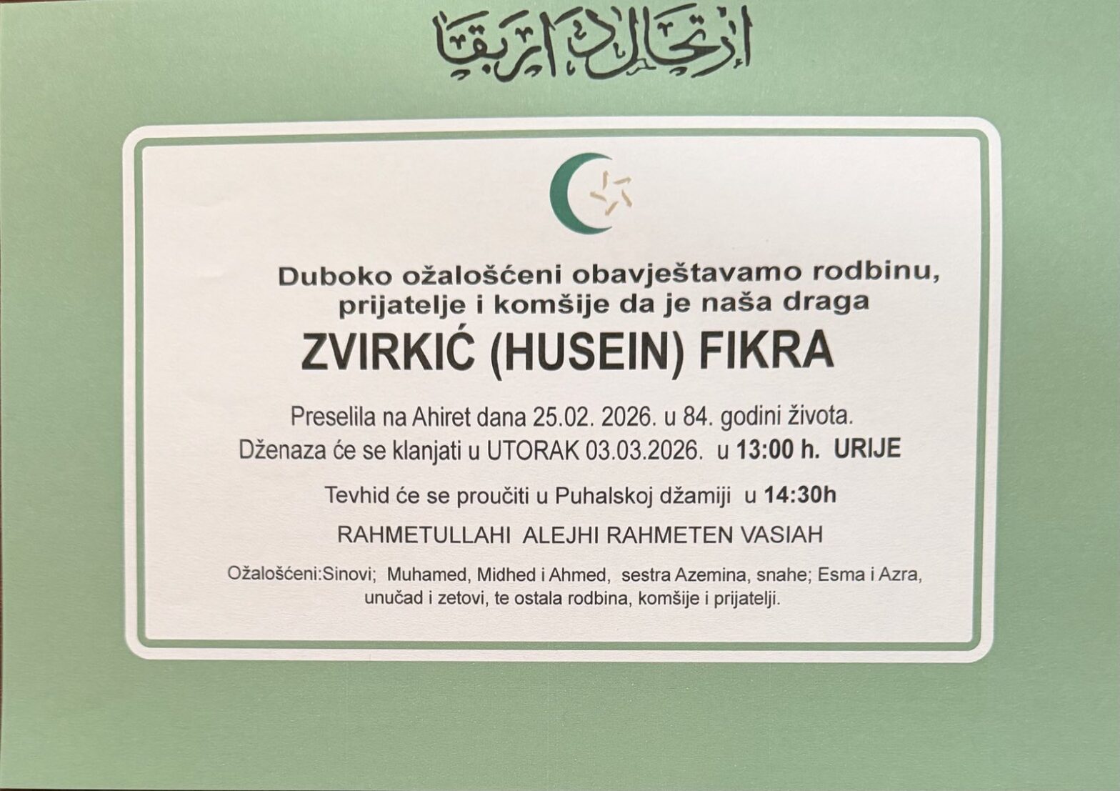 INNA LILLAHI VE INNA ILEJHI RADŽIUN “Svi smo Allahovi i svi se Njemu vraćamo.” (Kur’an) Molimo Uzvišenog Allaha da joj se smiluje, oprosti grijehe i uvede u Džennet, a porodici podari sabur. AMIN