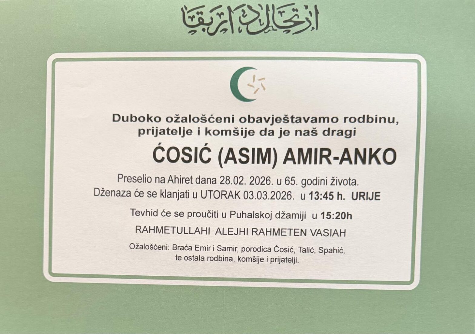 INNA LILLAHI VE INNA ILEJHI RADŽIUN “Svi smo Allahovi i svi se Njemu vraćamo.” (Kur’an) Molimo Uzvišenog Allaha da mu se smiluje, oprosti grijehe i uvede u Džennet, a porodici podari sabur. AMIN