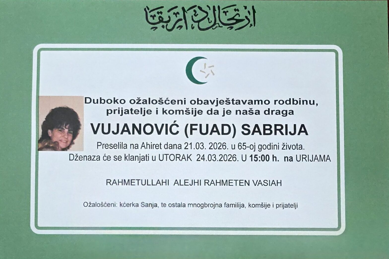 INNA LILLAHI VE INNA ILEJHI RADŽIUN “Svi smo Allahovi i svi se Njemu vraćamo.” (Kur’an) Molimo Uzvišenog Allaha da joj se smiluje, oprosti grijehe i uvede u Džennet, a porodici podari sabur. AMIN