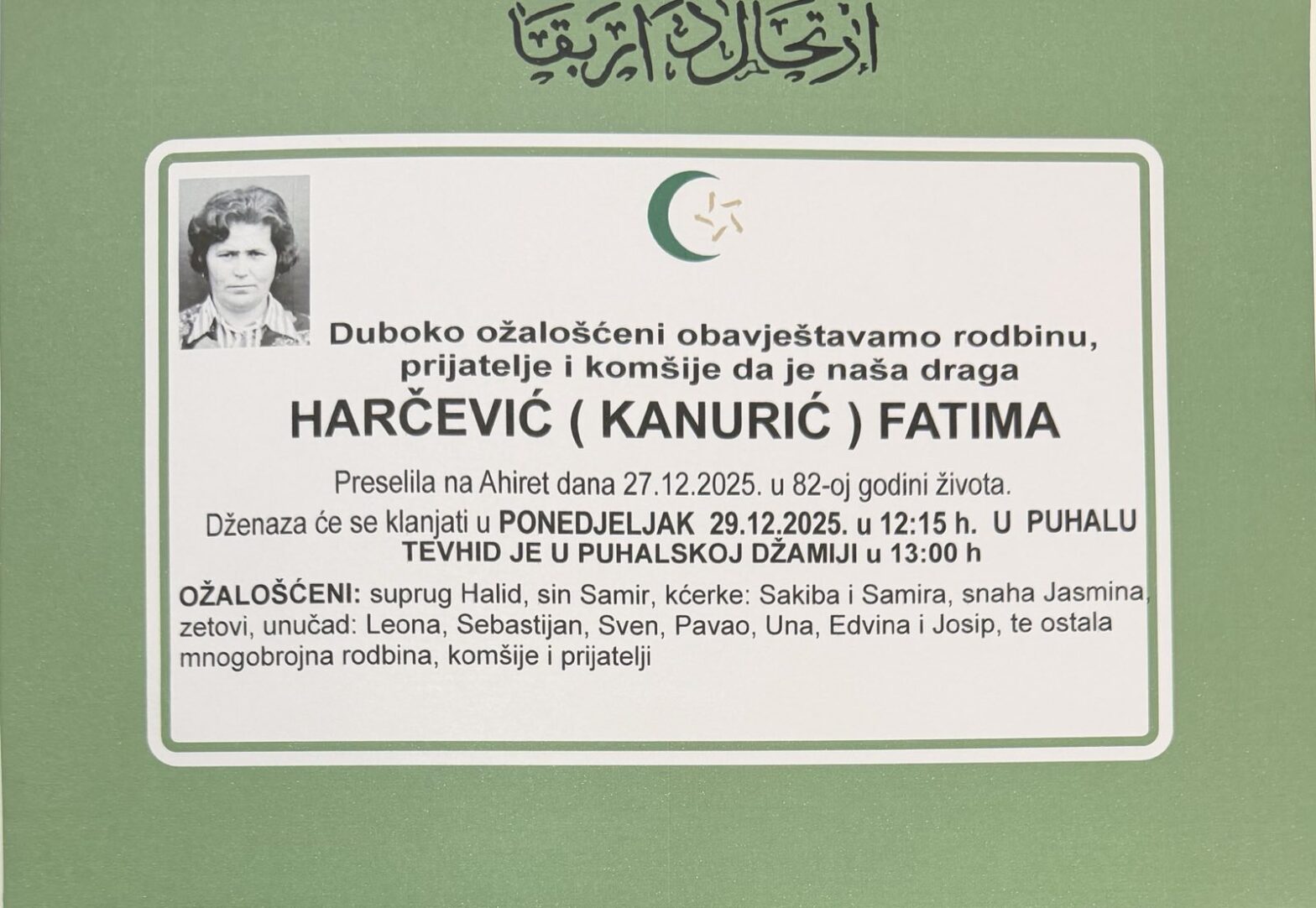 INNA LILLAHI VE INNA ILEJHI RADŽIUN “Svi smo Allahovi i svi se Njemu vraćamo.” (Kur’an) Molimo Uzvišenog Allaha da joj se smiluje, oprosti grijehe i uvede u Džennet, a porodici podari sabur. AMIN