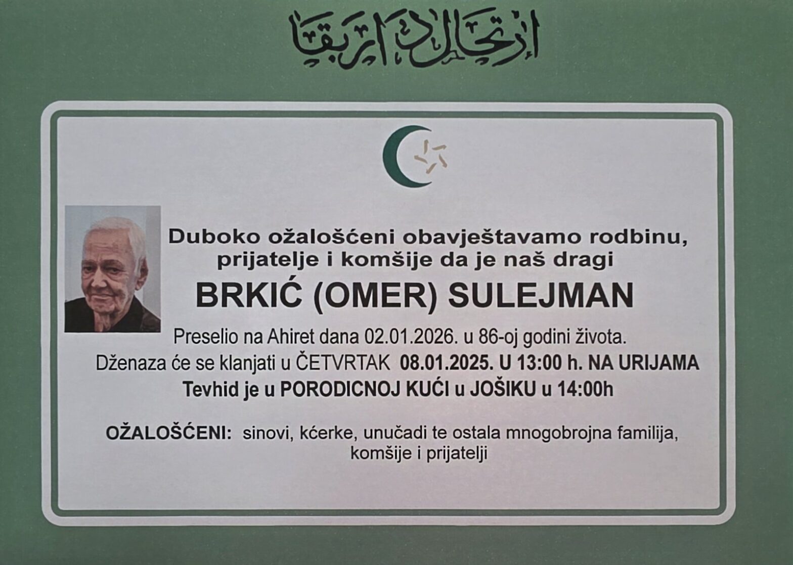 INNA LILLAHI VE INNA ILEJHI RADŽIUN“Svi smo Allahovi i svi se Njemu vraćamo.” (Kur’an) Molimo Uzvišenog Allaha da mu se smiluje, oprosti grijehe i uvede u Džennet, a porodici podari sabur. AMIN