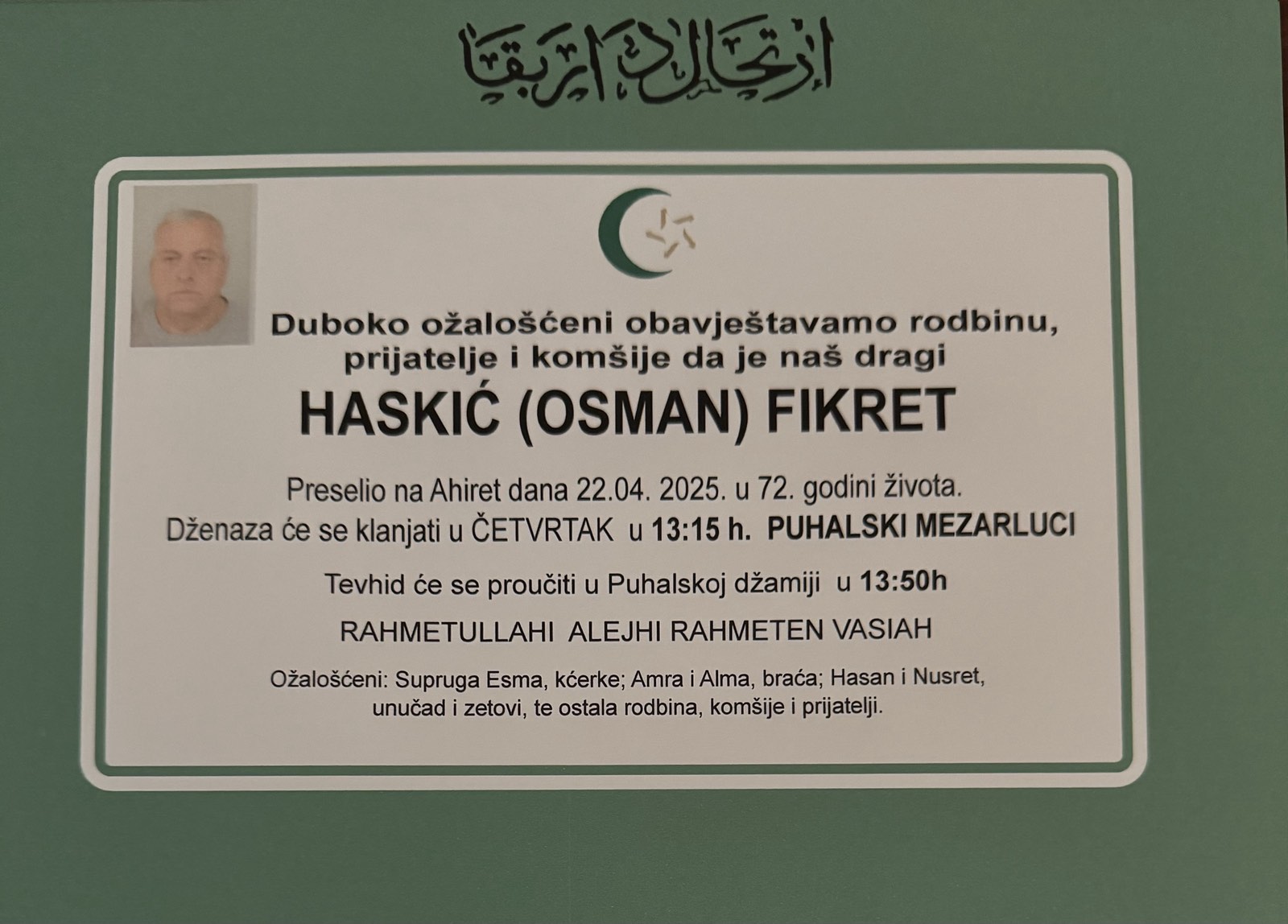 Molimo Uzvišenog Allaha da mu se smiluje, oprosti grijehe i uvede u Džennet, a porodici podari sabur. AMIN