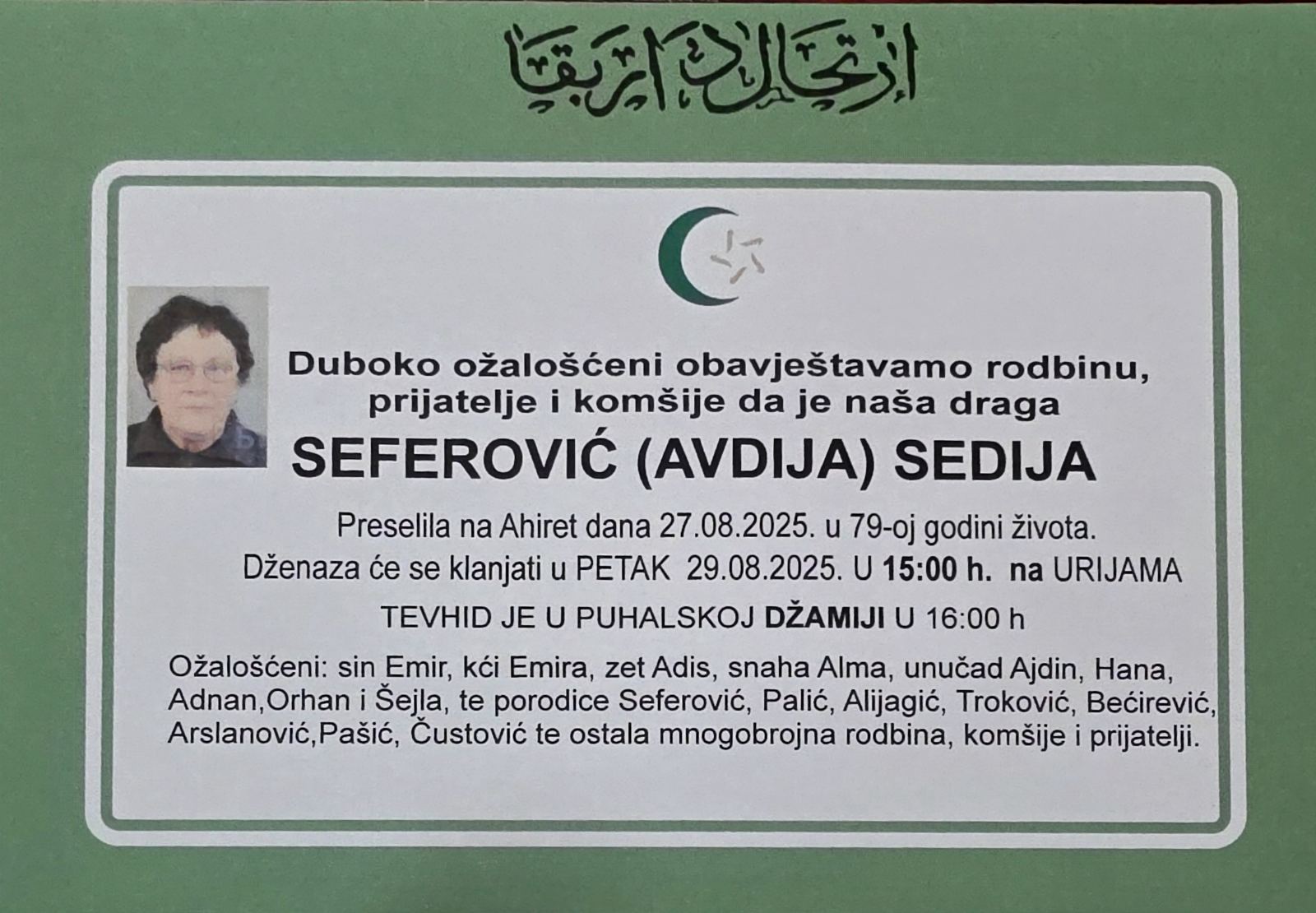 Molimo Uzvišenog Allaha da joj se smiluje, oprosti grijehe i uvede u Džennet, a porodici podari sabur. AMIN